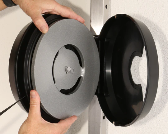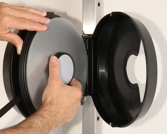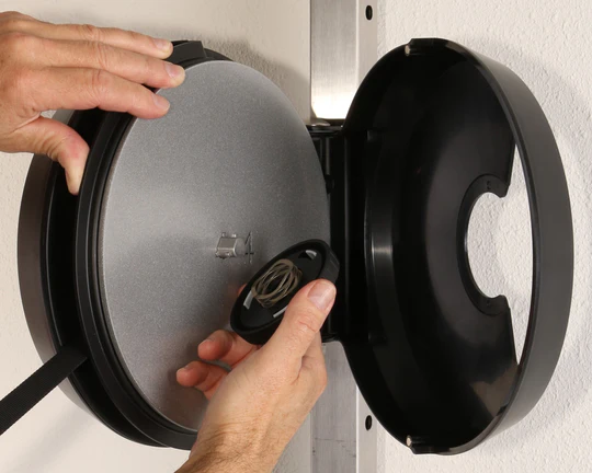 Chwyć tarczę obiema rękami i zdejmij ją z osi centralnej. Zamień tarczę na inną. Grubsza tarcza (w mm) sprawia, że ćwiczenia stają się trudniejsze i wolniejsze, natomiast cieńsza tarcza (w mm) ułatwia ćwiczenia i czyni je bardziej dynamicznymi. Zamontuj wymienione tarcze przyciskiem szybkiego zwalniania i zamknij drzwi.